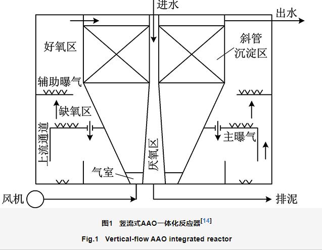 整合工藝流程、縮小占地面積是一體化AAO工藝亟待解決的問題。肖炘圻等[14]設計了豎流式一體化反應器(圖1)處理農村生活污水,該反應器將常規AAO工藝中單獨設置的厭氧區、缺氧區、好氧區和沉淀區整合為一體,考察了HRT和好氧區溶解氧(DO)濃度對處理效果的影響。結果表明,HRT為8 h,DO濃度為2.5 mg/L時,出水COD和NH3-N、TN、TP濃度均可以滿足GB 18918—2002《城鎮污水處理廠污染物排放標準》一級A標準。針對一體化工藝中污泥處理處置問題,任宏洋等[15]將AAO系統中剩余污泥臭氧化處理,研究了處理后污泥減量效果和污水處理效能,考察了污泥全部回流至厭氧區、等比例回流至厭氧區和缺氧區、全部回流至缺氧區3種回流方式下累積排泥量,發現耦合后的AAO系統排泥量分別下降了51.3%、49.8%、47.6%;另外研究發現,臭氧化污泥回流提高了污泥沉降性和系統的脫氮能力,且污泥回流區域對TP的去除率有較大影響,確定等比例回流臭氧化污泥至厭氧區和缺氧區為最佳回流方式。